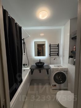 В ванной стиральная машинка, фен, зеркало с подсветкой