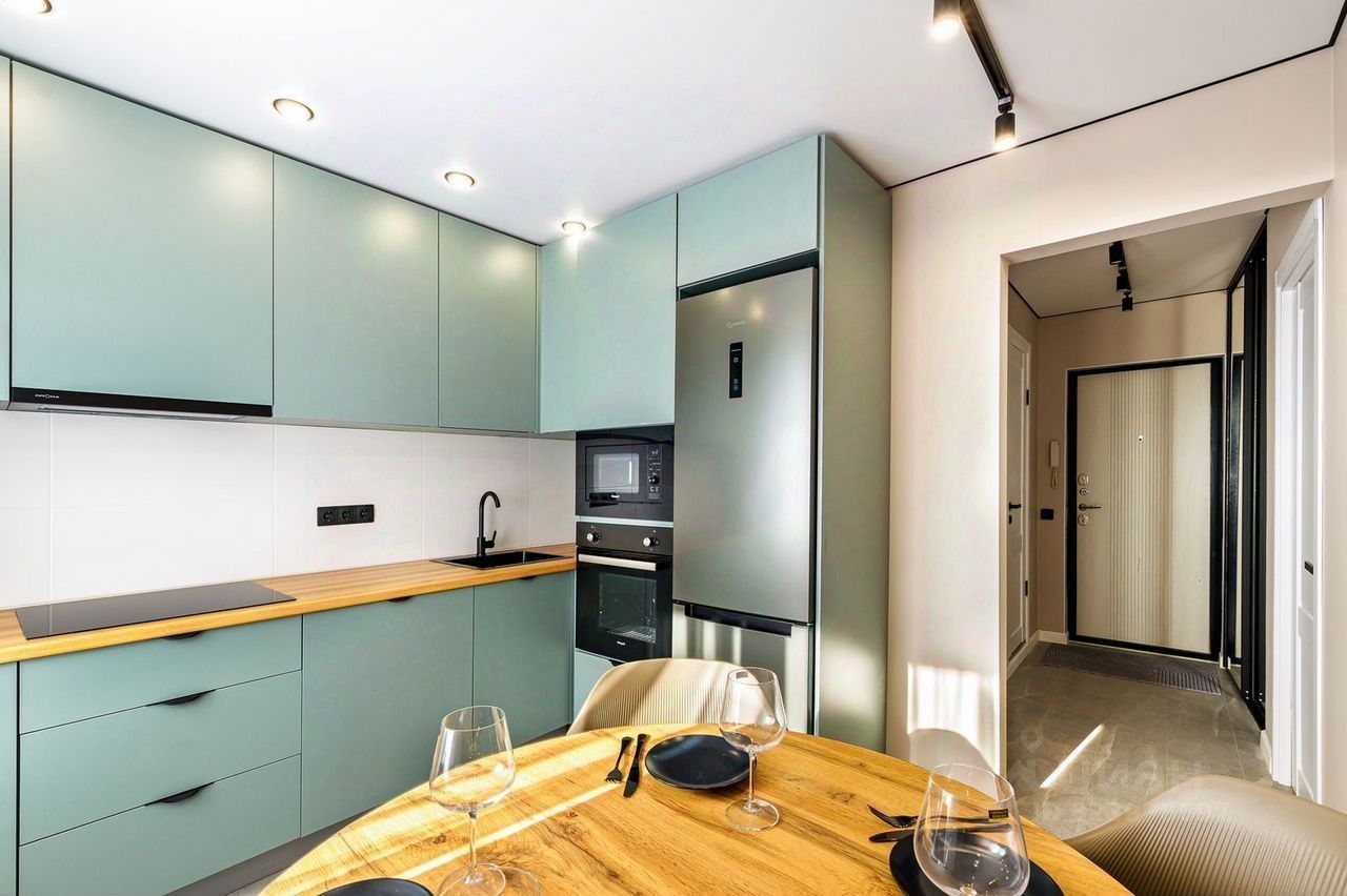 В квартире выполнен качественный евро-ремонт, есть все необходимое для комфортного проживания: отдельная гардеробная при входе, полный кухонный гарнитур, электро-плита, вытяжка, СВЧ печь, духовой шкаф и посудомоечная машина, большой обеденный стол, холодильник. Из кухни выход на просторную лоджию. В комнате большая двуспальная кровать с ортопедическим матрасом, в стену встроен просторный шкаф-купе под хранение вещей. Выполнено дизайнерское освещение комнаты. Раздельный С/У. В ванной стиральная машина. Так же есть все бытовые принадлежности для комфортной жизни (чайник, посуда, сушилка для одежды и т.д.) В квартире ранее ни кто не проживал.