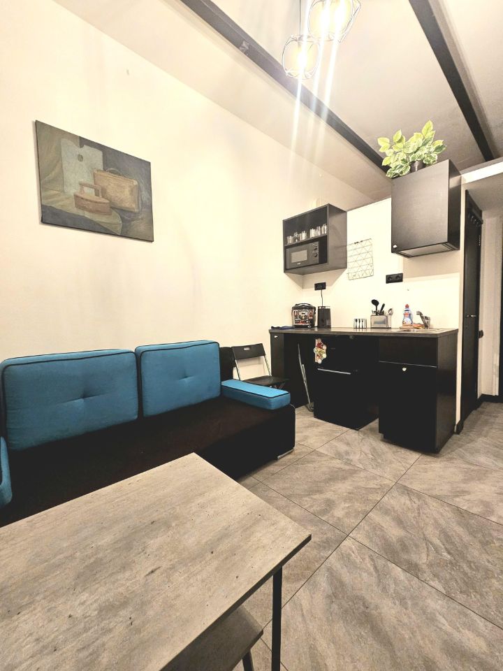 Студия двухуровневая. Второй уровень -спальная зона с удобной большой двуспальной кроватью. Внизу - гостиная зона с кухней.