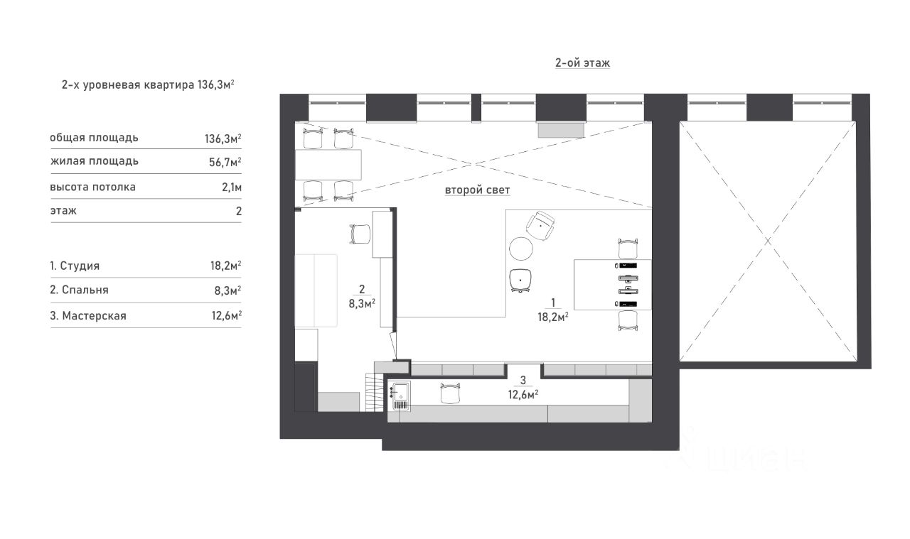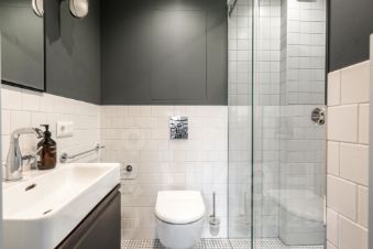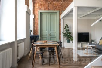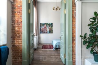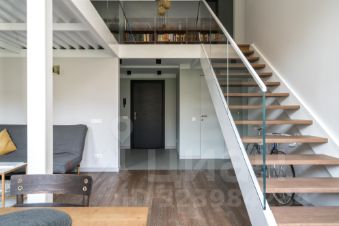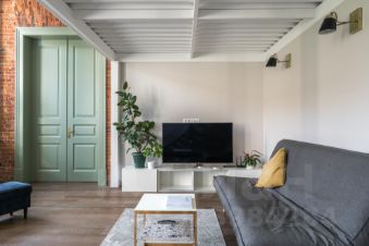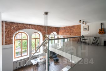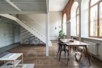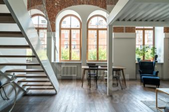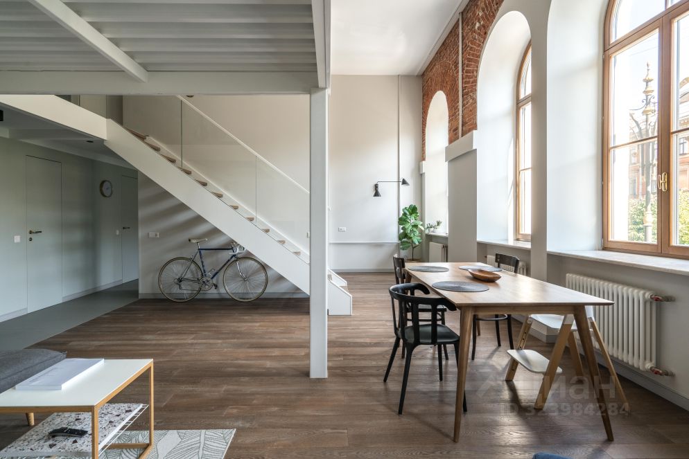 В квартире много света, благодаря большим окнам, высоты которых хватает на оба уровня. Ремонт в квартире выполнен в минималистичном стиле, с сохранением исторических элементов.