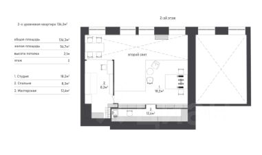 На втором уровне: пространство, которое можно использовать как рабочую зону и мастерскую, детская комната и кладовая. Детская комната отделена стеклянной перегородкой от остального пространства.
