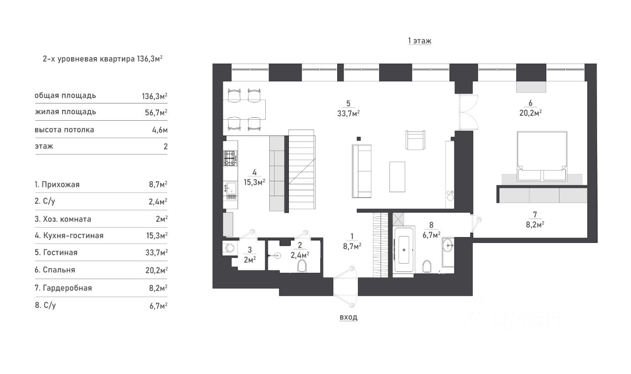 В квартире на первом уровне: компактная кухня-столовая, уютная гостиная, спальня с гардеробной и собственной ванной комнатой. Также на первом этаже расположен второй санузел и постирочная.