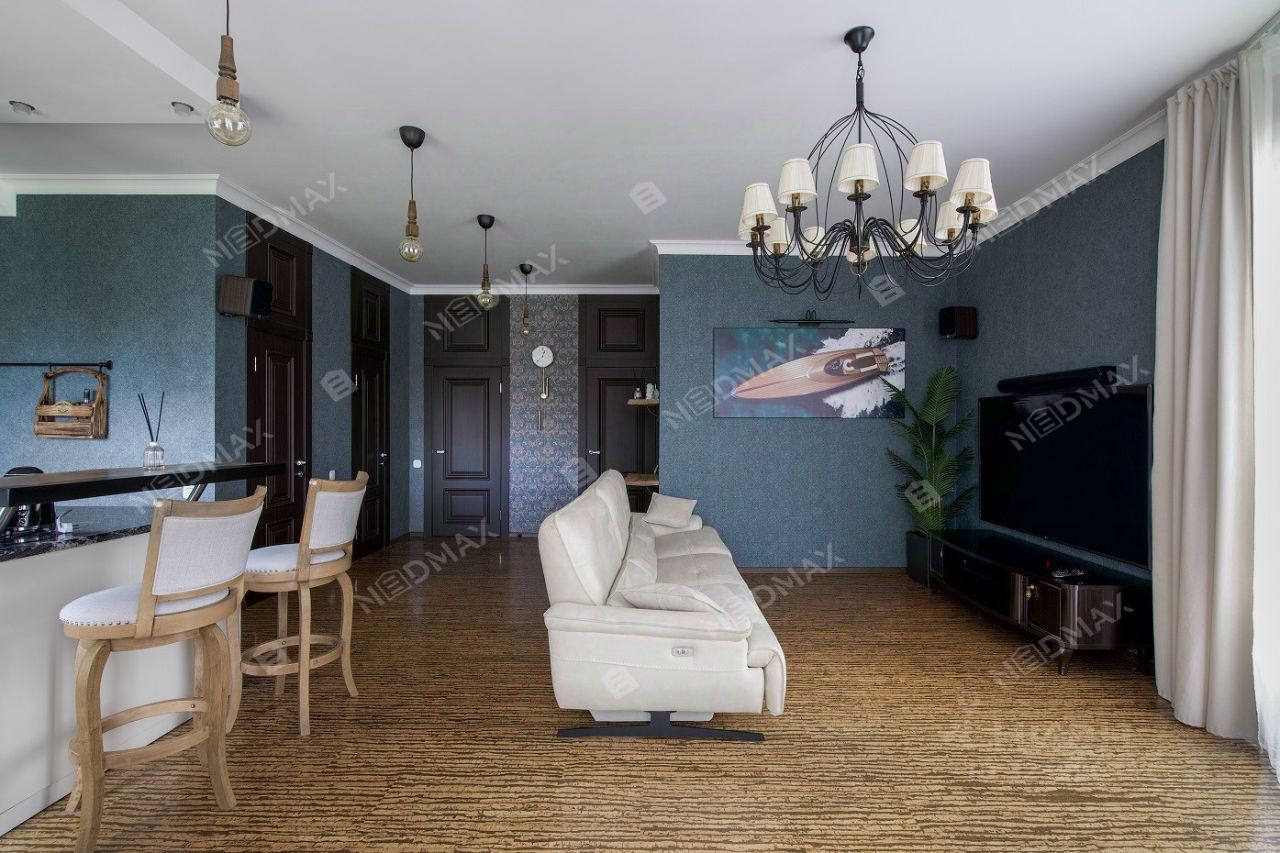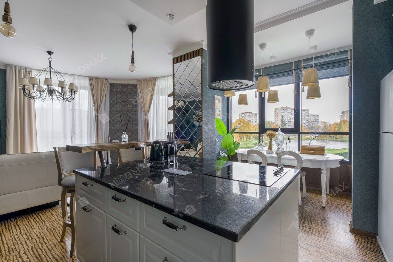 просторная кухня-гостиная с панорамными окнами, что обеспечивает обилие света и воздуха, с выделенными гостевой, рабочей и столовой зонами. Автоматические шторы с электроприводом, премиальная техника на кухне.