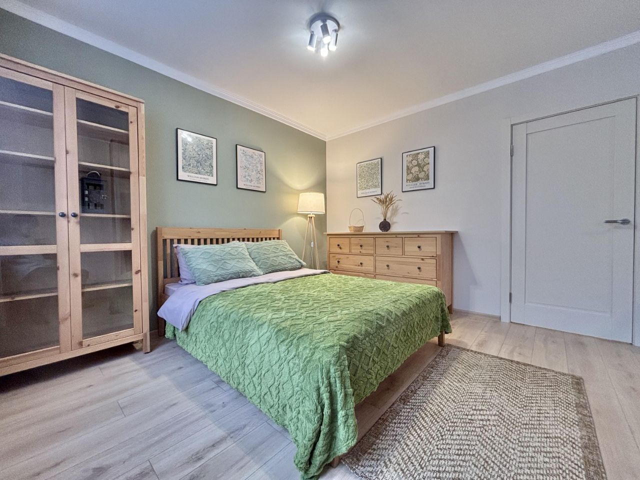 - В зоне отдыха располагается полноценная кровать, вместительный комод для вещей, буфет (шкаф витрина), телевизор, также будет установлен универсальный туалетный/рабочий стол.