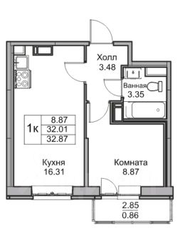 Однокомнатная квартира 32 м2 (евродвушка).