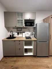 Студия оборудована всей мебелью и техникой, вплоть до посуды, постельных принадлежностей. Много места для хранения.