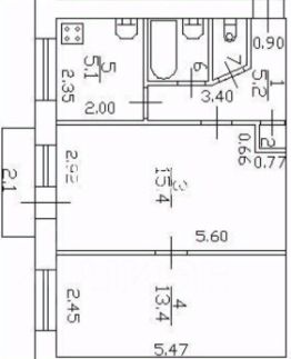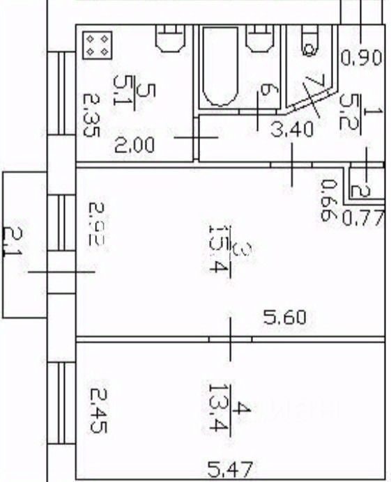 - Площадь по комнатам: кухня 5.1 м²; гостиная 15.4 м²; спальня 13.4 м²