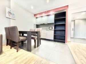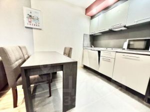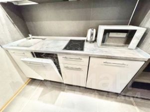 Установлена кухня, встроенный холодильник, посудомоечная машина, варочная поверхность, микроволновка, чайник, рабочее место, диван, обеденный стол;