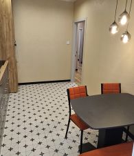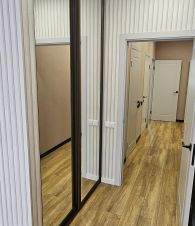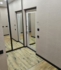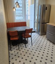 - Зонирование: в квартире удалось эргономично разделить пространство на изолированную входную зону с хранением, ванную и еще одну отдельную туалетную комнату, зону кухни-столовой с выделенным полноценным рабочим местом, а также просторную спальню с большой гардеробной и комнату с диван-кроватью.