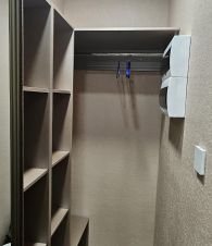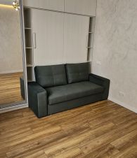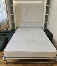 - Мебель: в ванной, зоне кухни, на балконе, в спальнях выполнена по индивидуальным чертежам. Комнаты и прихожая обустроены уникальной системой хранения вещей, а также трансформером, который позволяет двумя движениями превратить комнату с диваном в спальню с полноценной кроватью размером 200х140. Ортопедический матрас кровати обеспечит наивысший комфорт сна. две вместительных гардеробных позволит расположить внутри крупногабаритные вещи, а также всю одежду как на полках, так и на вешалках.
