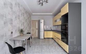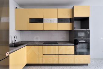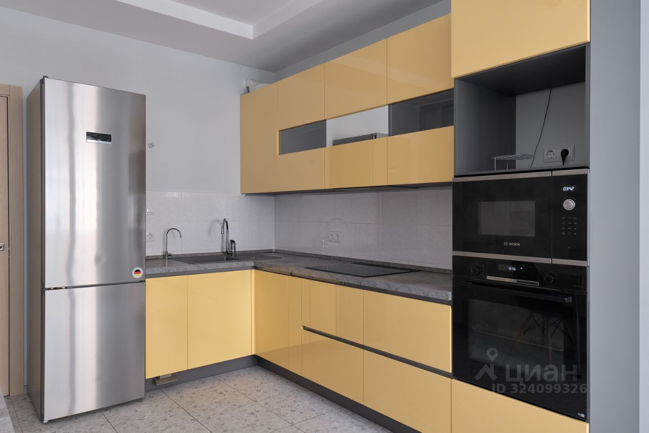 В кухне площадью 15.2 кв.м. есть кухонный гарнитур, техника марки Bosch: холодильник, варочная панель, духовка, микроволновая печь, посудомоечная машина.
