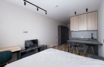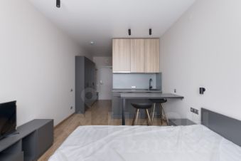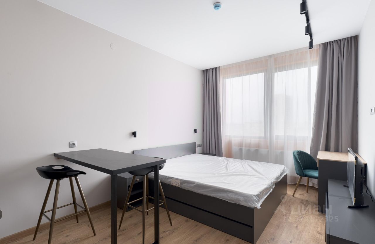 + Есть вся необходимая мебель и техника: кровать 180*200 с местом для хранения, ТВ, кухня с холодильником и варочной поверхностью, шкафы, стиральная машина;