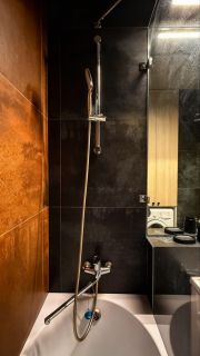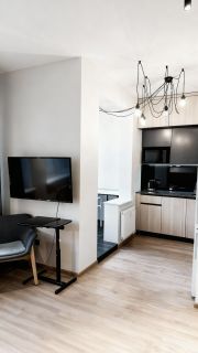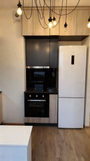 - Кухня, в которую входит: электрическая плита, духовой шкаф, посудомойка,холодильник, микроволновка, чайник, посуда, фильтр для воды