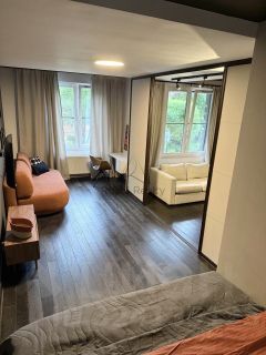 В квартире выполнен качественный дизайнерский ремонт, предусмотрена функциональная планировка: спальня разделена на уютную зону отдыха и удобное рабочее пространство с диваном.