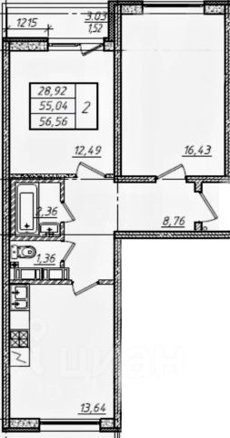 Квартира имеет двустороннюю планировку с комнатами правильной формы 16,4 и 12,5 кв.метров, раздельными санузлами и просторной кухней 13,6 кв.метров.