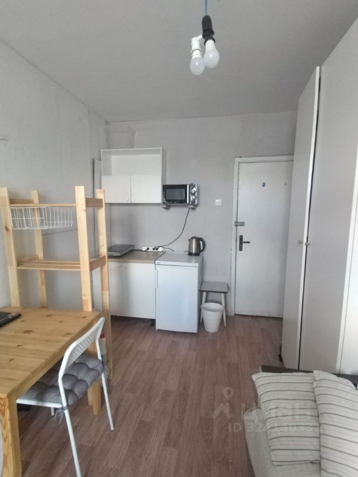 шкаф, небольшая кухня, с холодильником, чайником, плитой и микроволновкой, этажерка, стол и диван. Окно - стеклопакет.