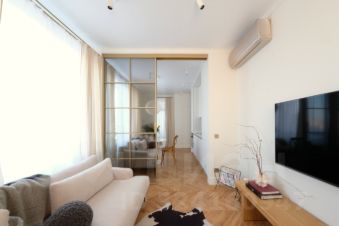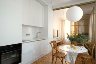 Квартиру выбирали и делали для себя, поэтому она отличается качественным дизайнерским ремонтом, в котором продумана каждая деталь, использованы дорогие строительные и отделочные материалы (натуральный паркет, каменная столешница, лепнина).