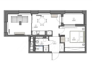 Общая площадь составляет 46 кв м и включает в себя кухню-гостиную, спальню, совмещенный санузел и лоджию.