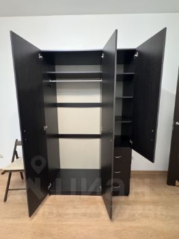Вместительный шкаф в комнате, двуспальный диван, духовой шкаф.