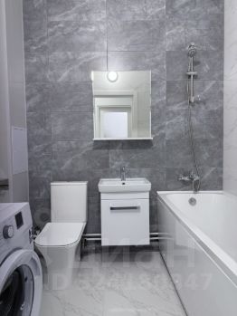стильный совмещенный санузел под ванну, со стиральной машинкой и теплым полом.