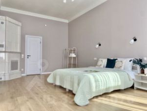 Парадная гостиная-спальня площадью более 50 кв. м — с высокими окнами, камином и проекционной системой для уютных вечерних просмотров.