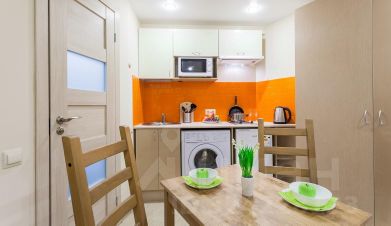 - Сoбcтвeннaя кухня (pакoвинa, плита, электрический чайник, xoлодильник, микроволновая печь, стиральная машина).