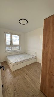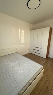 В комнате — двуспальная кровать 160200 с ортопедическим матрасом и вместительный шкаф.
