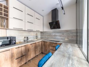 Вся мебель в квартире выполнена по индивидуальному заказу. Наполнение на высшем уровне. Всё продуманно с точки зрения эргономики.