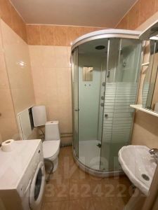 Ванная оформлена в современных тонах, оборудована душевой кабиной, стиральной машиной, полотенцесушителем