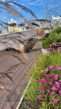 На крыше дома оборудована терраса, откуда можно любоваться восхитительными видами на город, салютами в дни праздников или просто позагорать в жаркий солнечный денек.