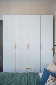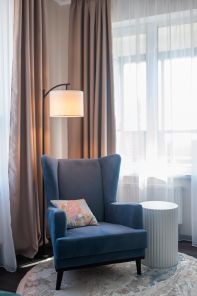 - уютная спальня : двуспальная кровать, вместительный шкаф, рабочая зона ( стол со стулом), кресло в зоне для отдыха.