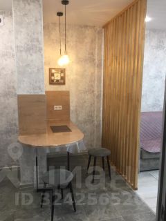-- Зонированное пространство: кухня и спальное место разделены натуральной деревянной перегородкой;