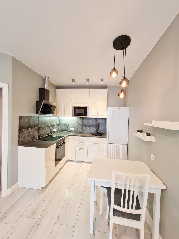 Кухня- Гостинная 17,8 кв. м. укомплектована мебелью ( диван, шкаф, стеклянный шкаф для посуды, обеденная группа, кухонный гарнитур со множеством мест для хранения, холодильник, микроволновая печь, духовой шкаф, варочная панель, вытяжка).