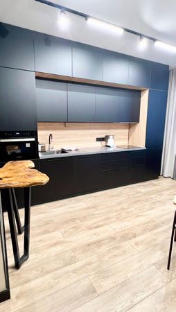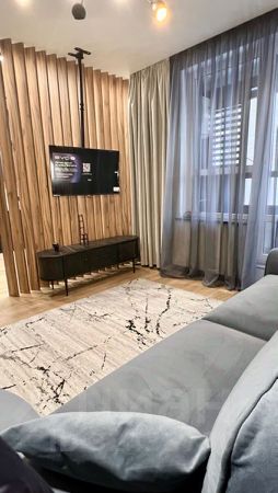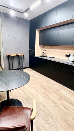 В квартире выполнен дизайнерский ремонт. Стены между комнат нет, есть перегородка. При этом для удобства проживающих предусмотрена необходимая мебель как в жилой комнате, так и на кухне. Из техники установлены новый телевизор, холодильник, стиральная машина, посудомоечная машина, микроволновая печь, электрическая плита и кондиционер. В здании имеется лифт.