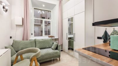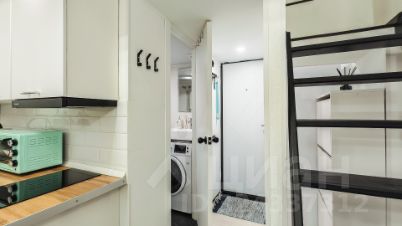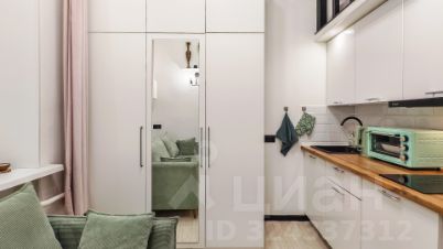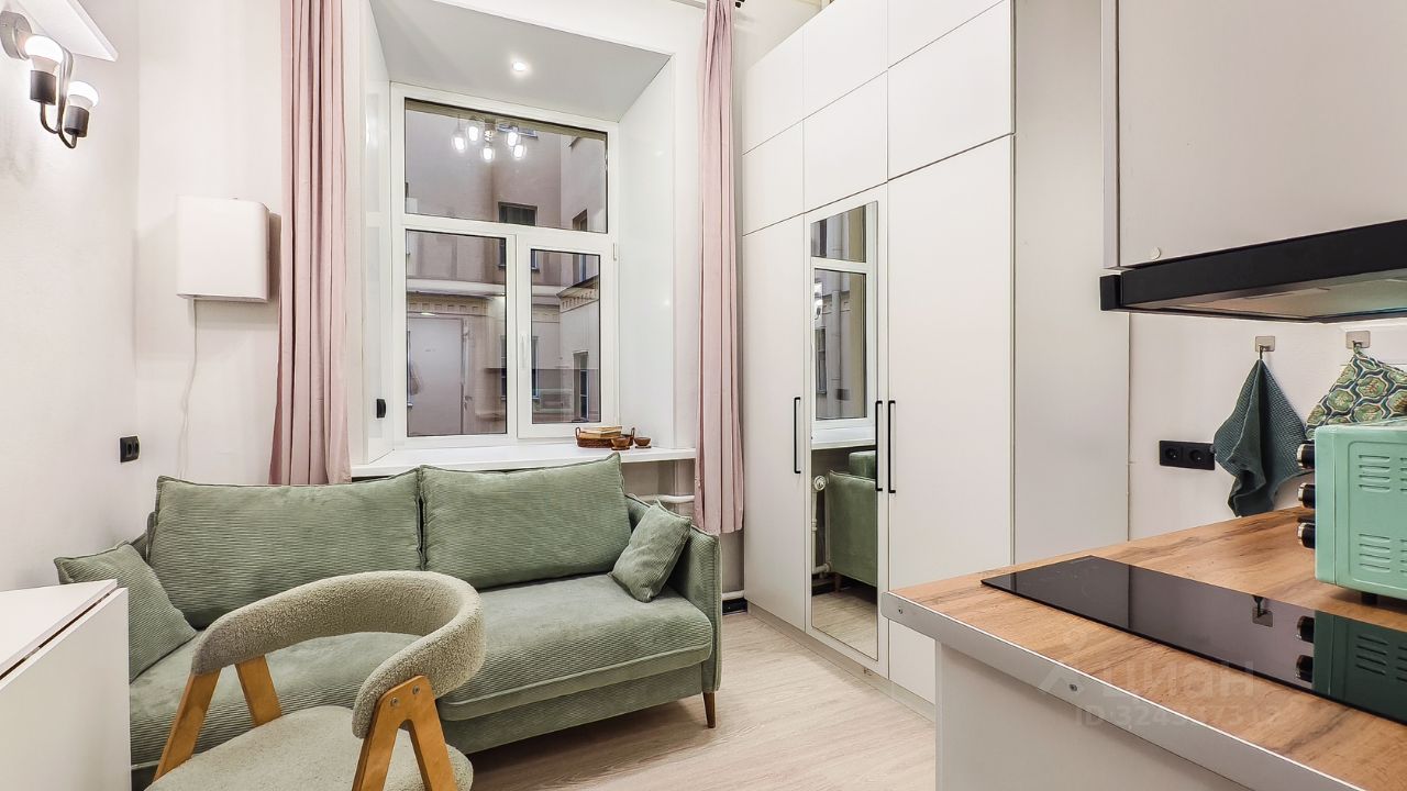 Варочная поверхность с вытяжкой, настольная духовка и полноразмерный холодильник размещены на кухне. Обеденный раскладной стол размещён у удобного дивана.