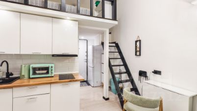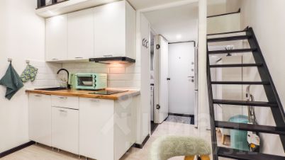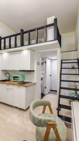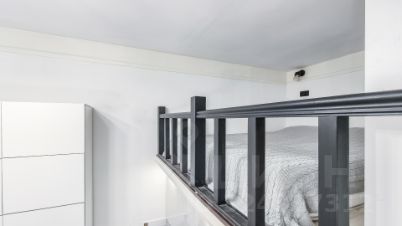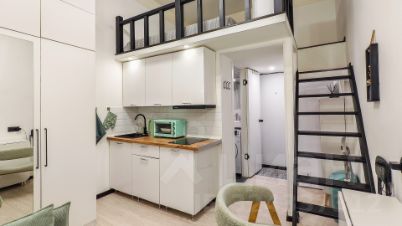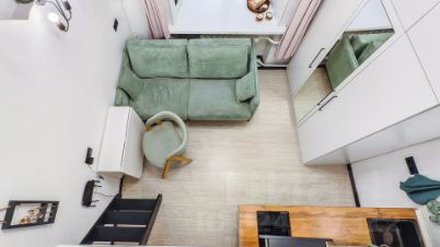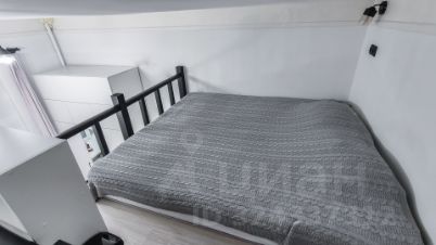 основной, с кухней, санузлом, рабочей зоной, вместительным шкафом с зеркалом, а также доступная по удобной лестнице с перилами спальня с большим матрасом, прикроватными светильниками и тумбочкой.