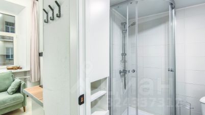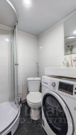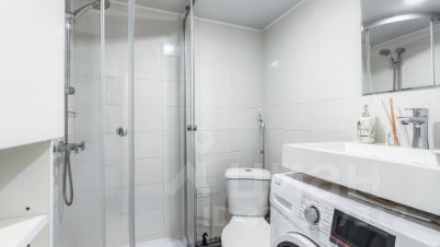 Кроме шкафа также есть обувница и вешалки под лестницей у входа. Там же находится вход в санузел. Аккуратная душевая в кафельной плитке. Здесь же расположена современная стиральная машина с сушкой, полочки и шкафчик.