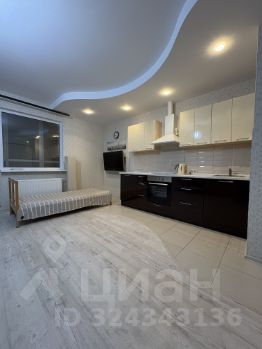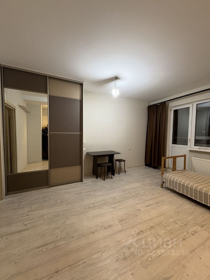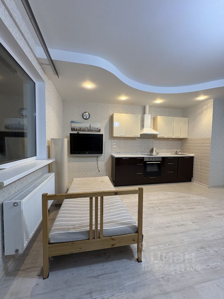 Студия 30 метров, много места, сделан евроремонт. Есть односпальная кровать и шкаф, обеденный стол. Из техники - холодильник, стиральная машина, встроенный духовой шкаф и варочная панель, чайник, телевизор.
