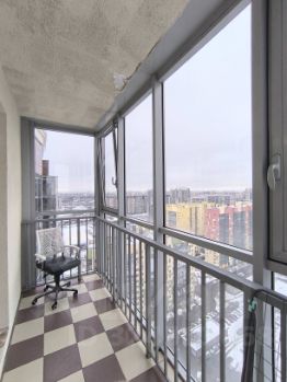 Большой застеклённый балкон с видом на город. По желанию — можем разместить там **удобное кресло/столик** для работы или вечернего отдыха с чашкой кофе.