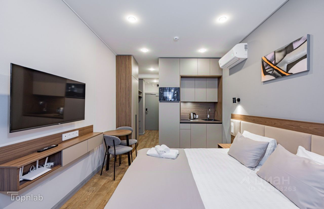 Ремонт в современном стиле, новая мебель и техника, есть кондиционер, посудомоечная машина, smart TV. В стоимость включены две поддерживающие уборки с заменой постельного белья и полотенец в месяц.