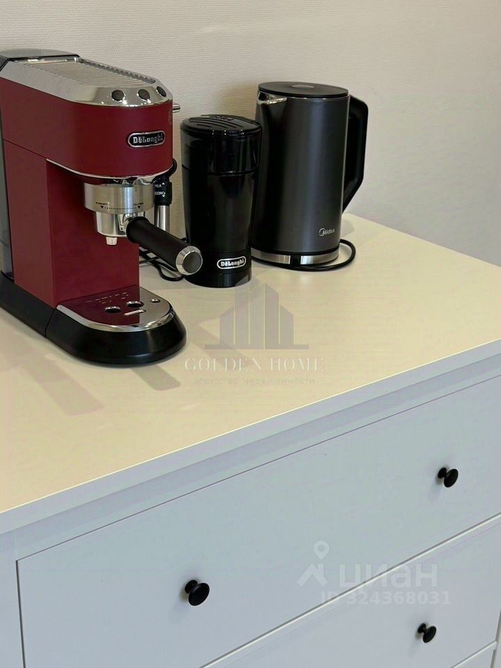 В квартире есть отдельная гардеробная, где удобно хранить все вещи. Кухня полностью оснащена всем необходимым для готовки и сервировки. Утро можно начать с ароматного кофе из новой кофемашины Delonghi.