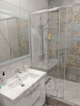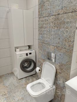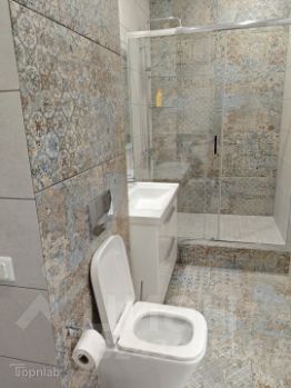 Большая 6-метровая ванная комната с прекрасной плиткой из Сквирел, зеркало с сенсорной подсветкой, качественная сантехника, душевая зона со стеклянной раздвижной перегородкой, полотенцесушитель с регулировкой температуры, стиральная машина.