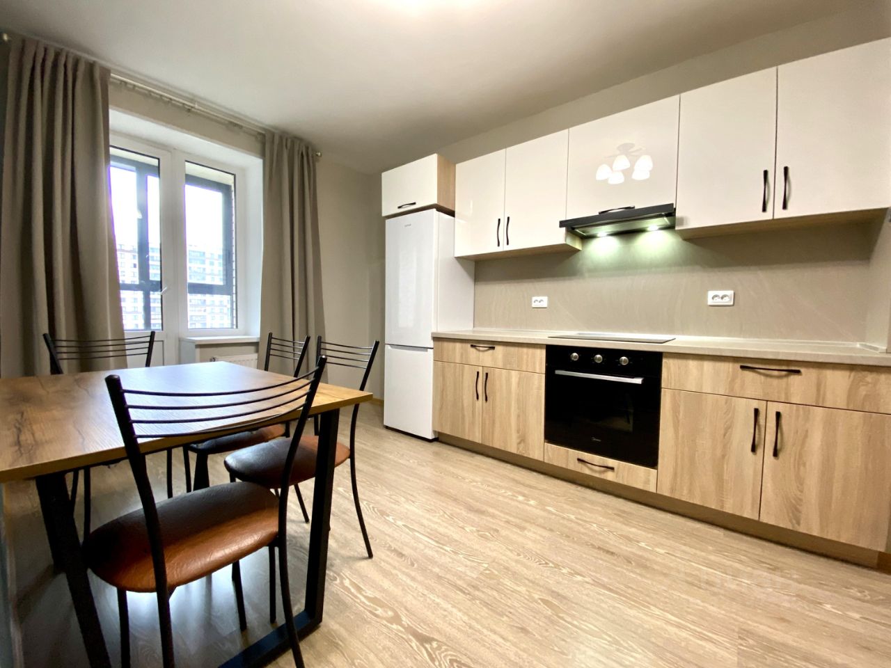 — просторная кухня, встроенный стильный кухонный гарнитур; духовой шкаф, электрическая варочная панель, вытяжка, холодильник; СВЧ-печь и чайник отсутствуют