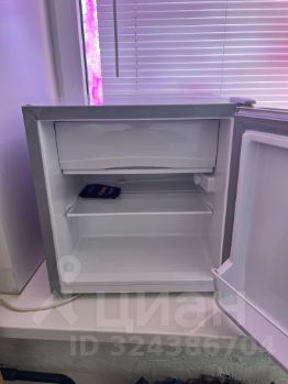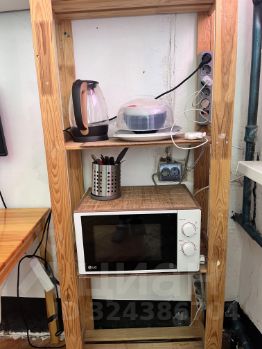 В комнате есть своя техника: холодильник, микроволновка, электрочайник и стиральная машинка.