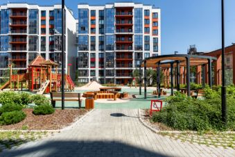 - Охраняемые территории, подвесные дворы, детские площадки, умные домофоны и облагороженные территории с развитой инфраструктурой.