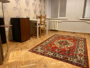 Общая площадь комнаты 13.7 кв.м, потолки 3.5 м, кухня 15 кв.м. Общая площадь всей квартиры 156 кв.м. Окна комнаты выходят во двор. Есть все необходимое для комфортного проживания.
