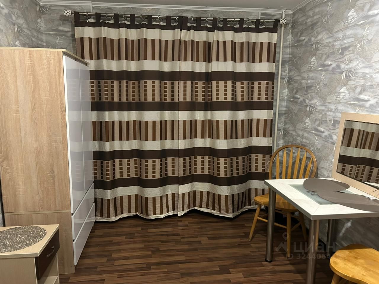 В комнате: платяной шкаф с 2 комодными отсеками. Стол, 2 стула и прикроватная тумба, настенное зеркало (повесим по вашему желанию). Термопот.