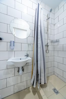 Современный санузел с душем, фен, стиpaльная мaшина, зеркало.