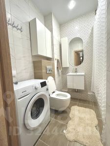Ванная оформлена в современных тонах, оборудована ванной, стиральной машиной, удобными шкафчиками