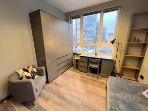 Вторая комната оборудована небольшим рабочим и спальным местом, с дополнительными местами для хранения, одежным шкафом и креслом.